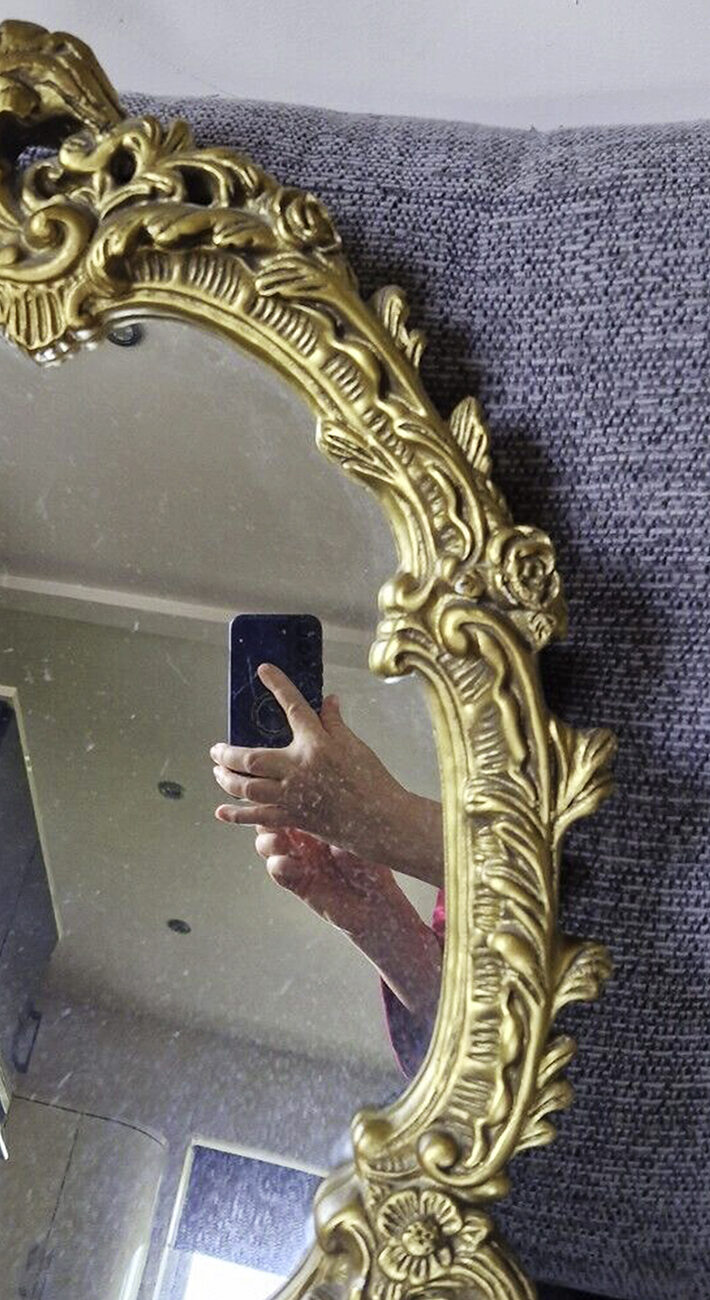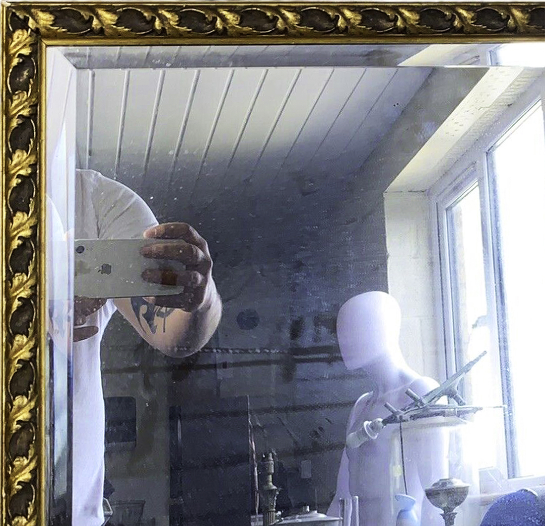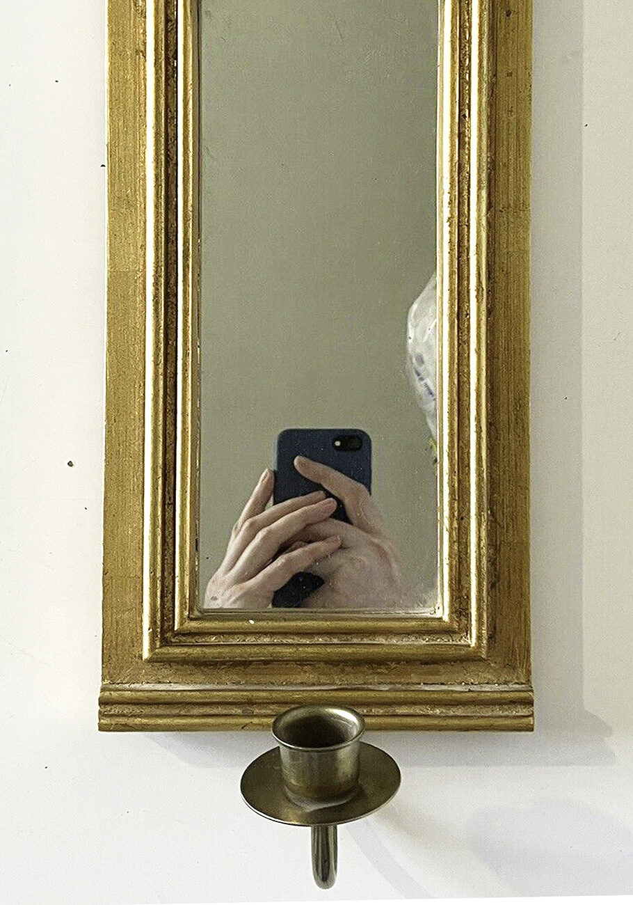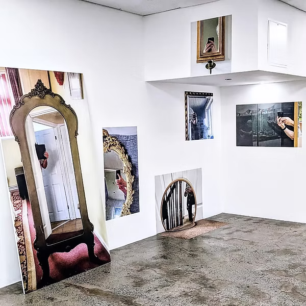 In the group exhibition Until You Touch it (2023), the images were printed on vinyl, creating flat portal-like mirrors where the hands seemed to appear through the walls themselves. One image of a freestanding mirror was printed at 1:1 scale and mounted on board, creating a life-size model.
