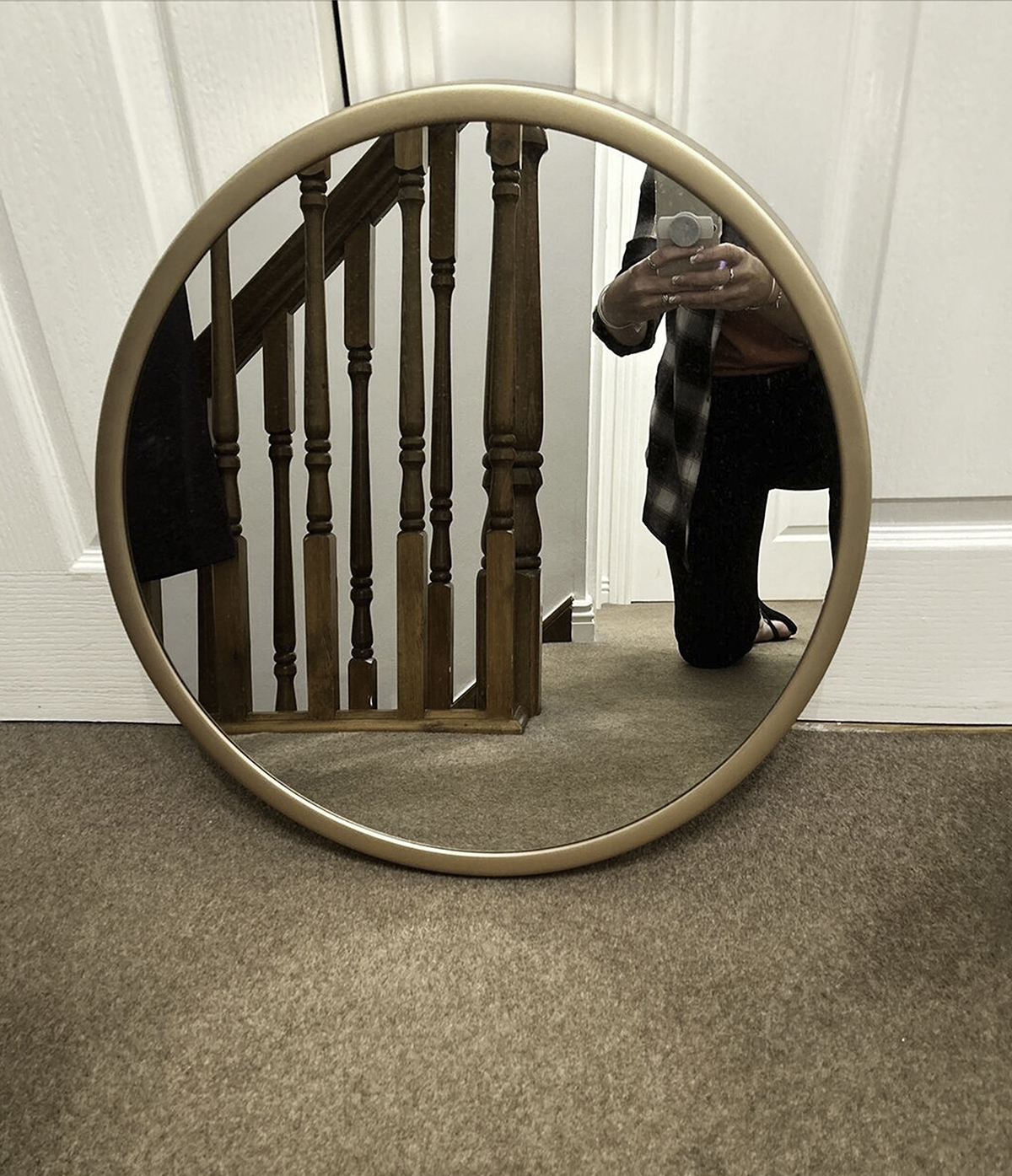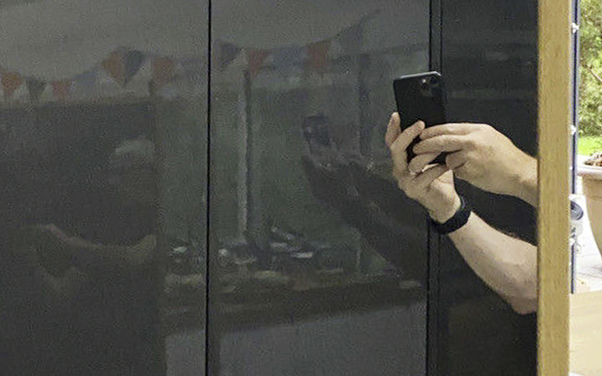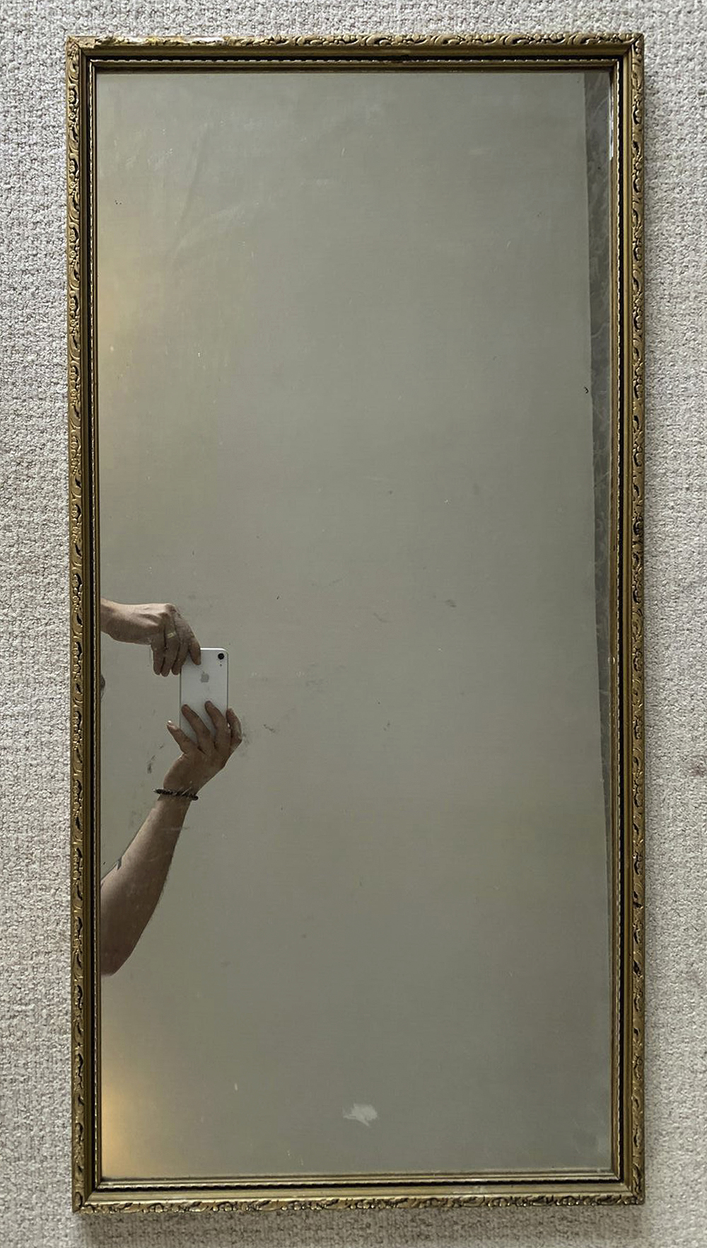 In the group exhibition Until You Touch it (2023), the images were printed on vinyl, creating flat portal-like mirrors where the hands seemed to appear through the walls themselves. One image of a freestanding mirror was printed at 1:1 scale and mounted on board, creating a life-size model.